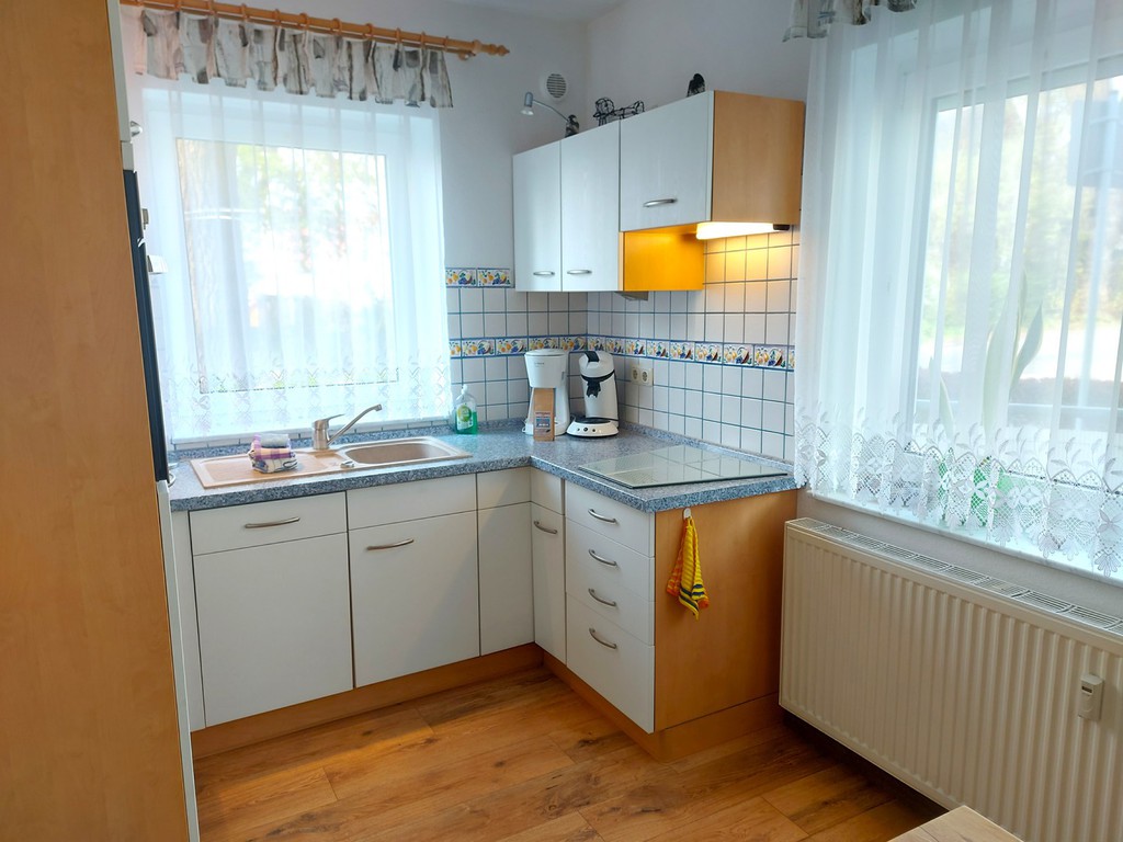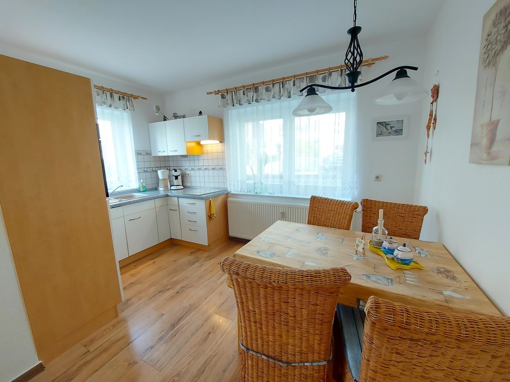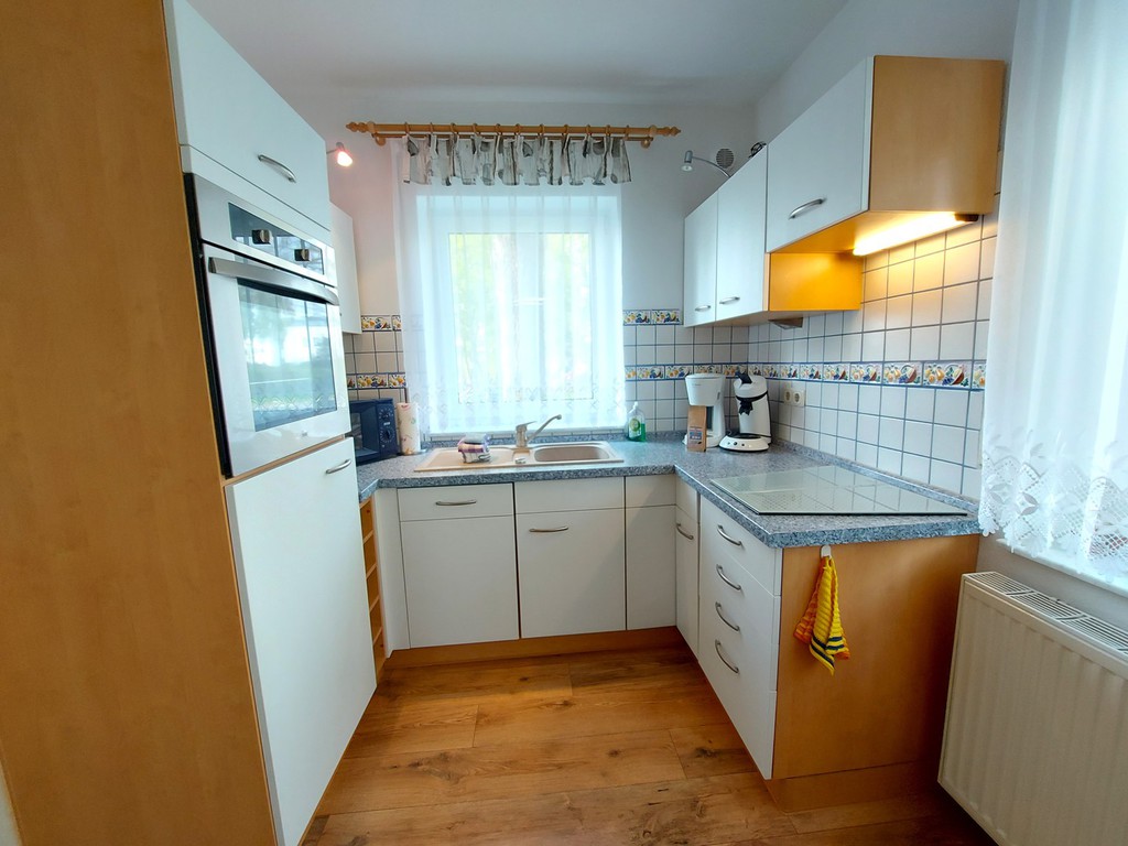 Leckeren Fisch den sie gerade am Hafen direkt vom Fischer geholt haben bereiten sie in der kompletten Einbauküche mit allem Komfort, wie Geschirrspüler, Mikrowelle, Ceranfeld, Kühlschrank mit Gefrierfach, Kaffemaschine, Wasserkocher und Toaster mit Freude zu.