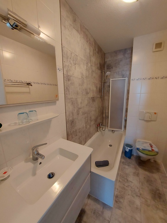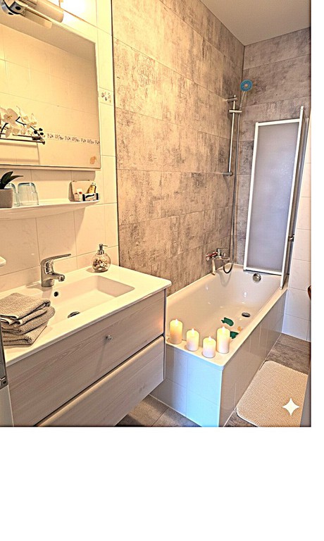 Im Bad erwartet sie zum entspannen eine große Badewanne mit Duschwand.