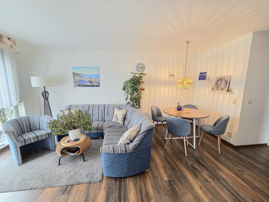 Sie verfügt über einen großen lichtdurchfluteten Wohnraum mit gemütlicher Eckcouch und Sessel die zum Sat.- Fernsehen oder zum Musikhören einladen oder gehen sie von hier auf den Balkon mit schönen Holzmöbeln und Sonnenschirm.