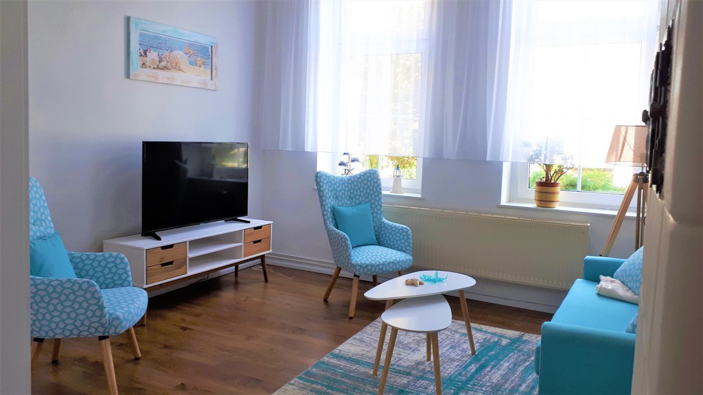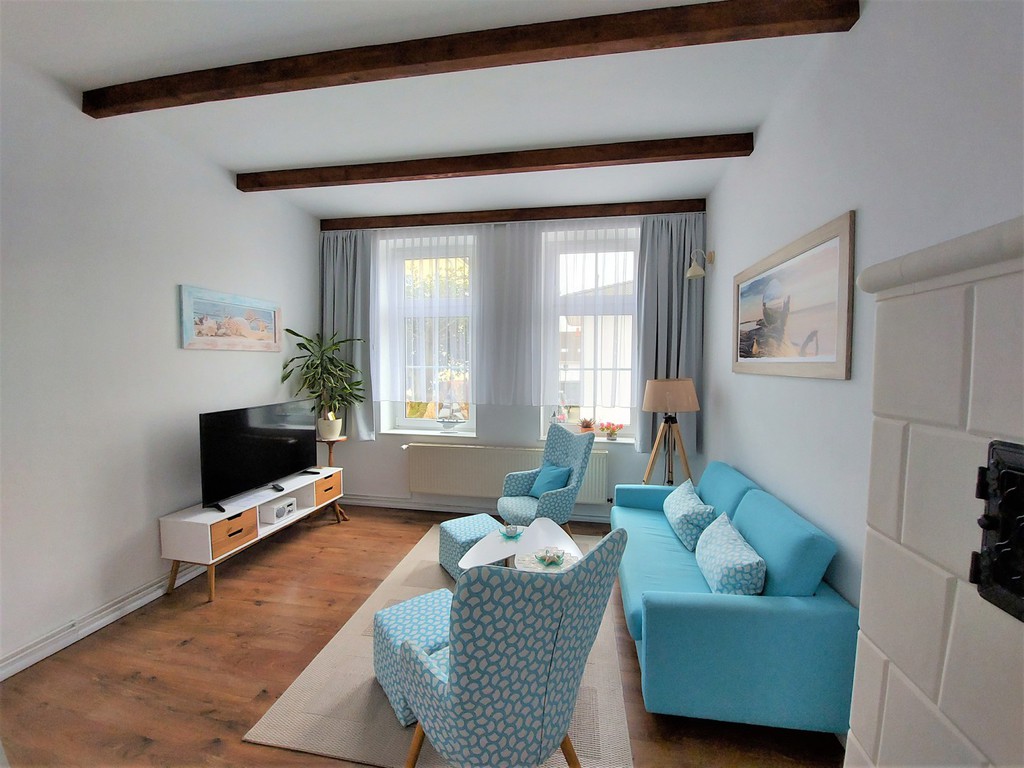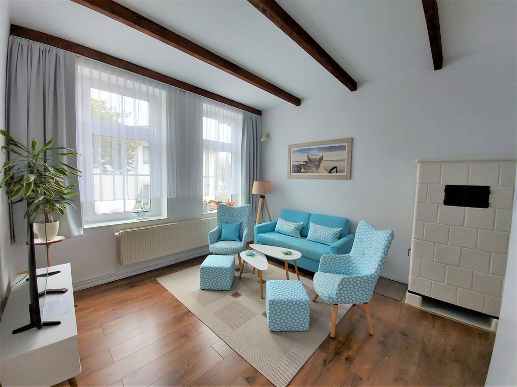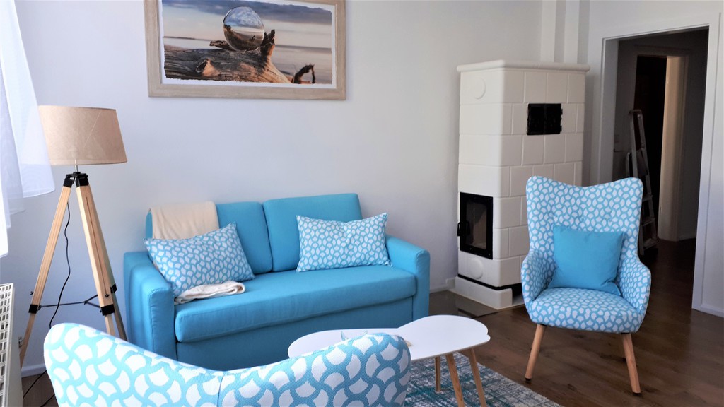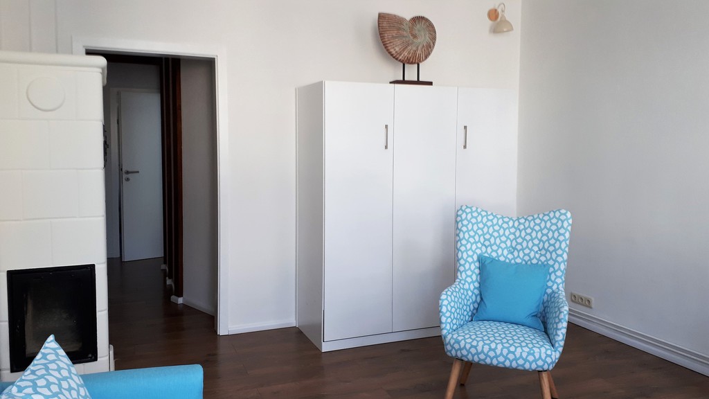 Die Wohnung Seestern besteht aus einem großen Wohnraum mit einem Sofa und 2 Sesseln mit Hocker und bei Bedarf einem Wandklappdoppelbett.