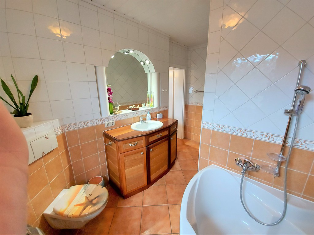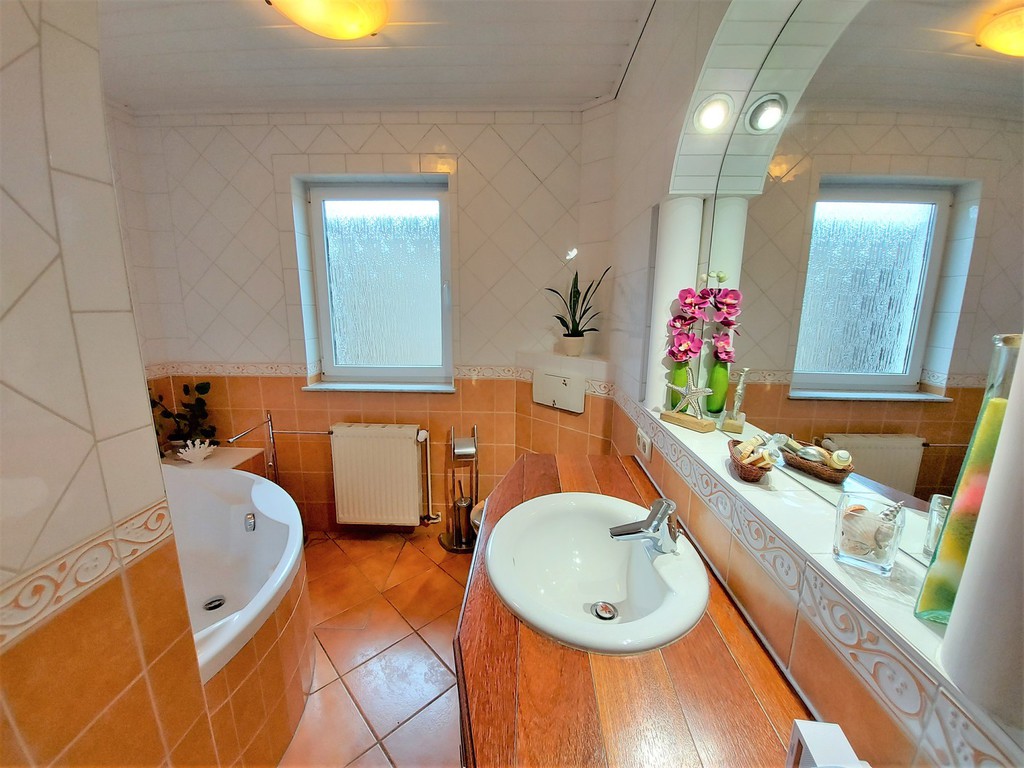 Im Tageslichtbad ist eine große Eckbadewanne.