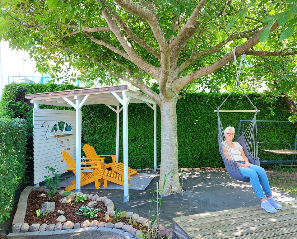 Ein Garten mit Sitzecken und Grill steht für ihre Entspannung bereit.